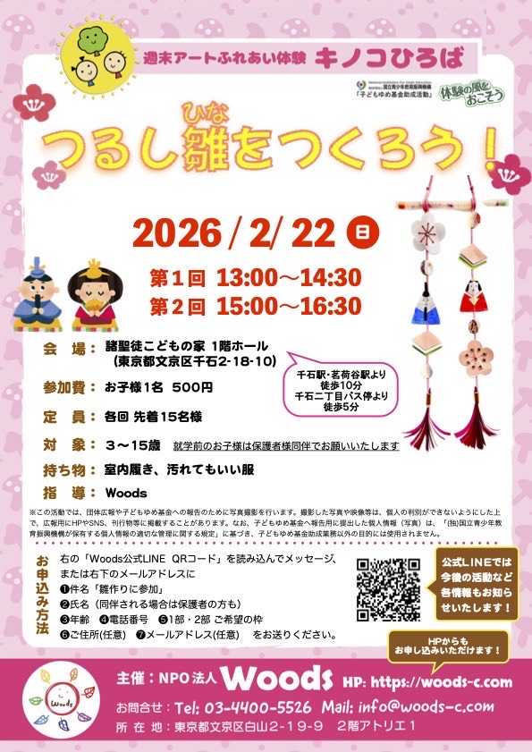2026年2月22日(日) つるしびなをつくろう! woods_staff22026-01-25T11:12:18+09:00 NEXT EVENT つるしびなをつくろう! つるしひなをつくろう! 日 程 2026年2月22日 (日) 時 間 第1回 13:00 ~ 14:30 第2回 15:00 ~ 16:30 会 場 諸聖徒こどもの家 1階ホール(東京都文京区2-18-10) 会場地図 ※こちらをクリック 参 加 費 お子様1名 500円 2月のキノコひろばでは3月3日のひなまつりにむけてつるして飾れるおひなさまをつくります!縁起のいいモチーフを織り交ぜながら世界に一つだけのおひな飾りを作って家族の健康をお祈りしましょう🌸 必須 参加したいイベント名 選択してくださいつるしびなをつくろう 必須 保護者様のお名前 1人目の情報 必須 お子さまのお名前 必須 お子さまの読み仮名 必須 お子さまの年齢 選択してください0123456789101112131415 2人目をお申し込みの場合、チェックを入れて情報を入力して下さい。 2人目の情報 任意 お子さまのお名前 任意 お子さまの読み仮名 任意 お子さまの年齢 選択してください0123456789101112131415 3人目をお申し込みの場合、チェックを入れて情報を入力して下さい。 3人目の情報 任意 お子さまのお名前 任意 お子さまの読み仮名 任意 お子さまの年齢 選択してください0123456789101112131415 4人目をお申し込みの場合、チェックを入れて情報を入力して下さい。 4人目の情報 任意 お子さまのお名前 任意 お子さまの読み仮名 任意 お子さまの年齢 選択してください0123456789101112131415 5人以上の場合は、備考欄にご記入ください 必須 イベント当日連絡可能な電話番号 任意 ご希望時間 13:00〜14:3015:00〜16:30 任意 ご住所 必須 メールアドレス 任意 その他 確認ページはございません。プライバシーポリシー、キャンセルポリシーをお読みになり、内容をご確認の上チェックを入れて送信してください。 ※お申し込み完了メールが届かない方へ docomo、au、softbankなど各キャリアのセキュリティ設定のためユーザー受信拒否と認識されているか、お客様が迷惑メール対策等で、ドメイン指定受信を設定されている場合に、メールが正しく届かないことがございます。 メールの受信拒否設定をされている方は、以下のドメインの受信許可をお願いいたします。 @woods-c.com 前のページに戻る Share this post Facebook Twitter LinkedIn Google + Email